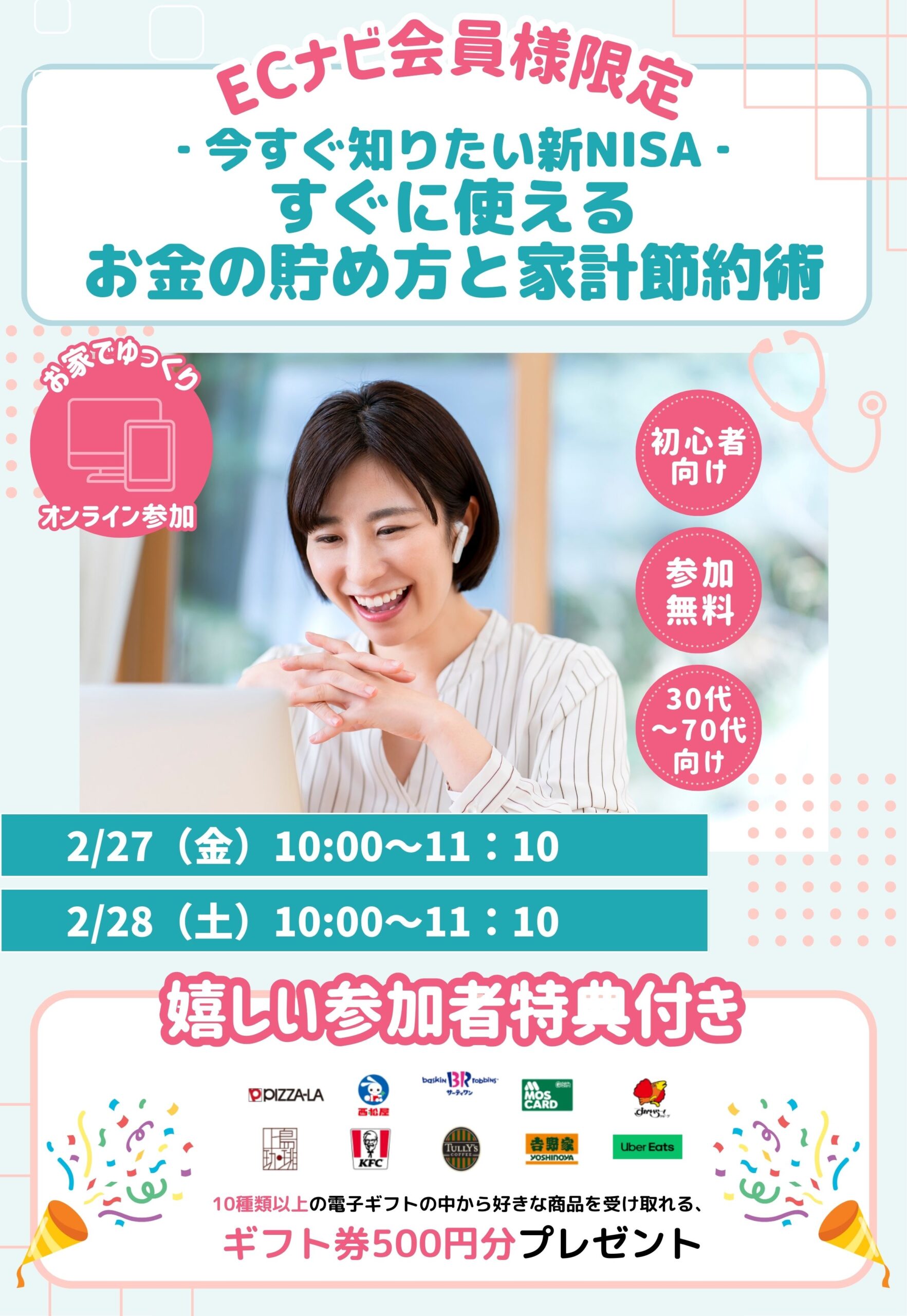 セミナー後のアンケート回答者全員に10種類以上の電子ギフトの中から好きな商品を受け取れる、ギフト券500円分プレゼント!